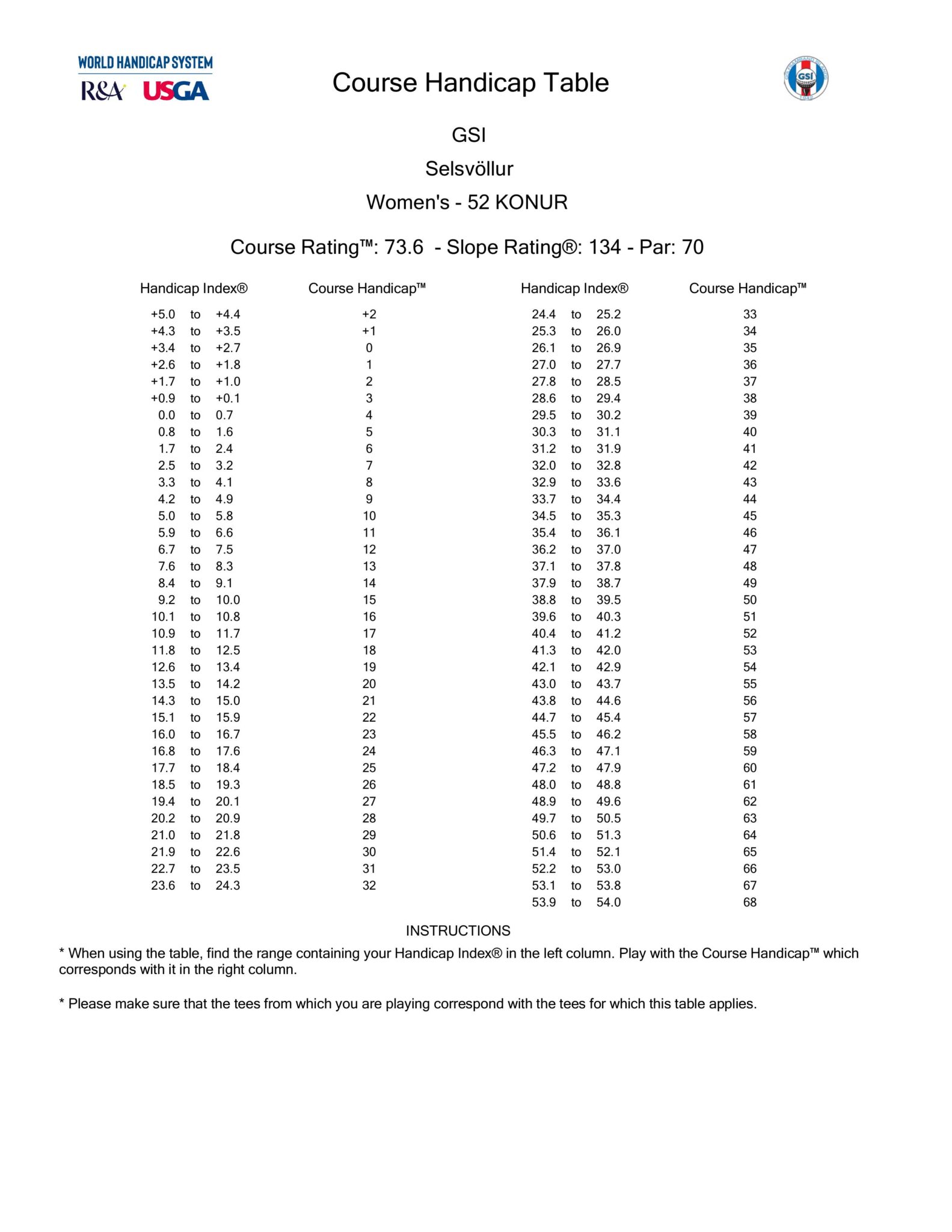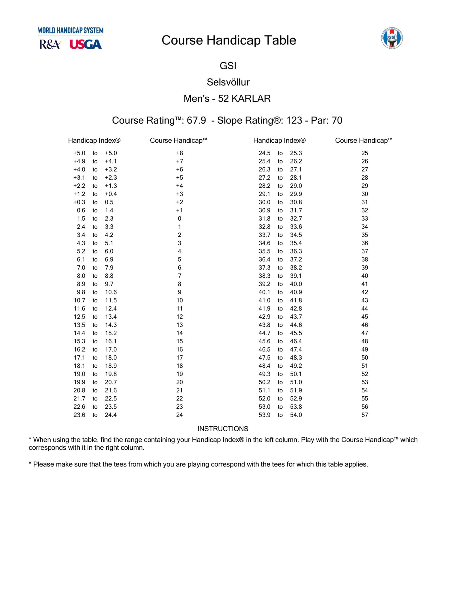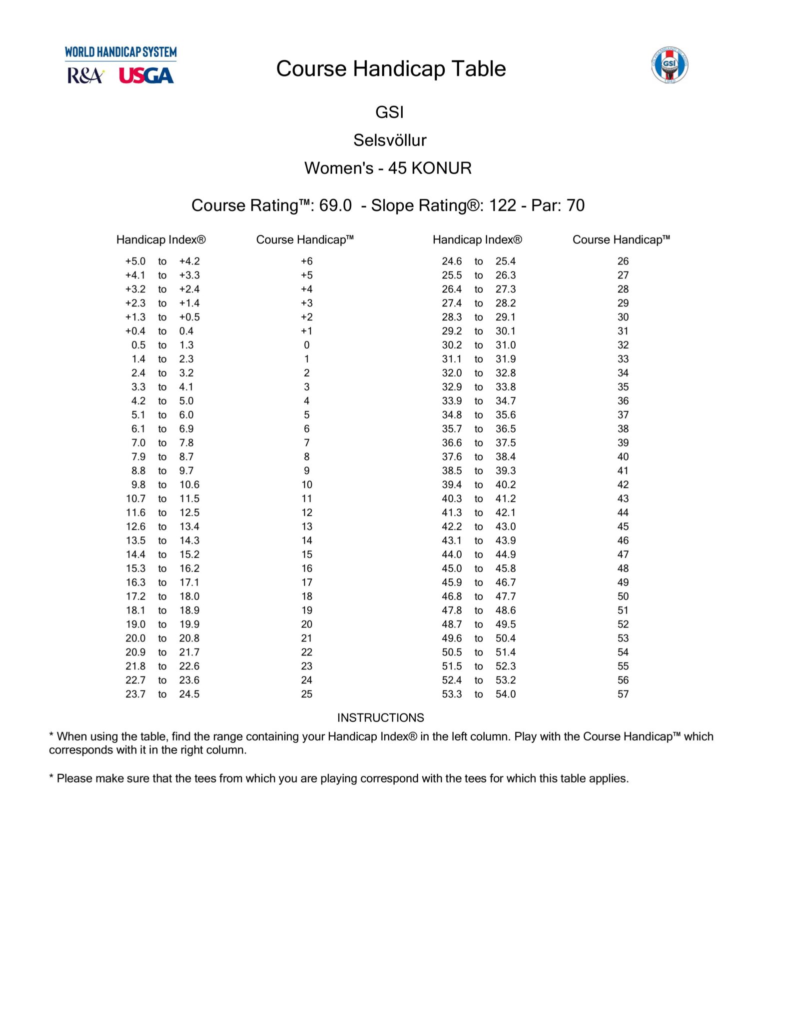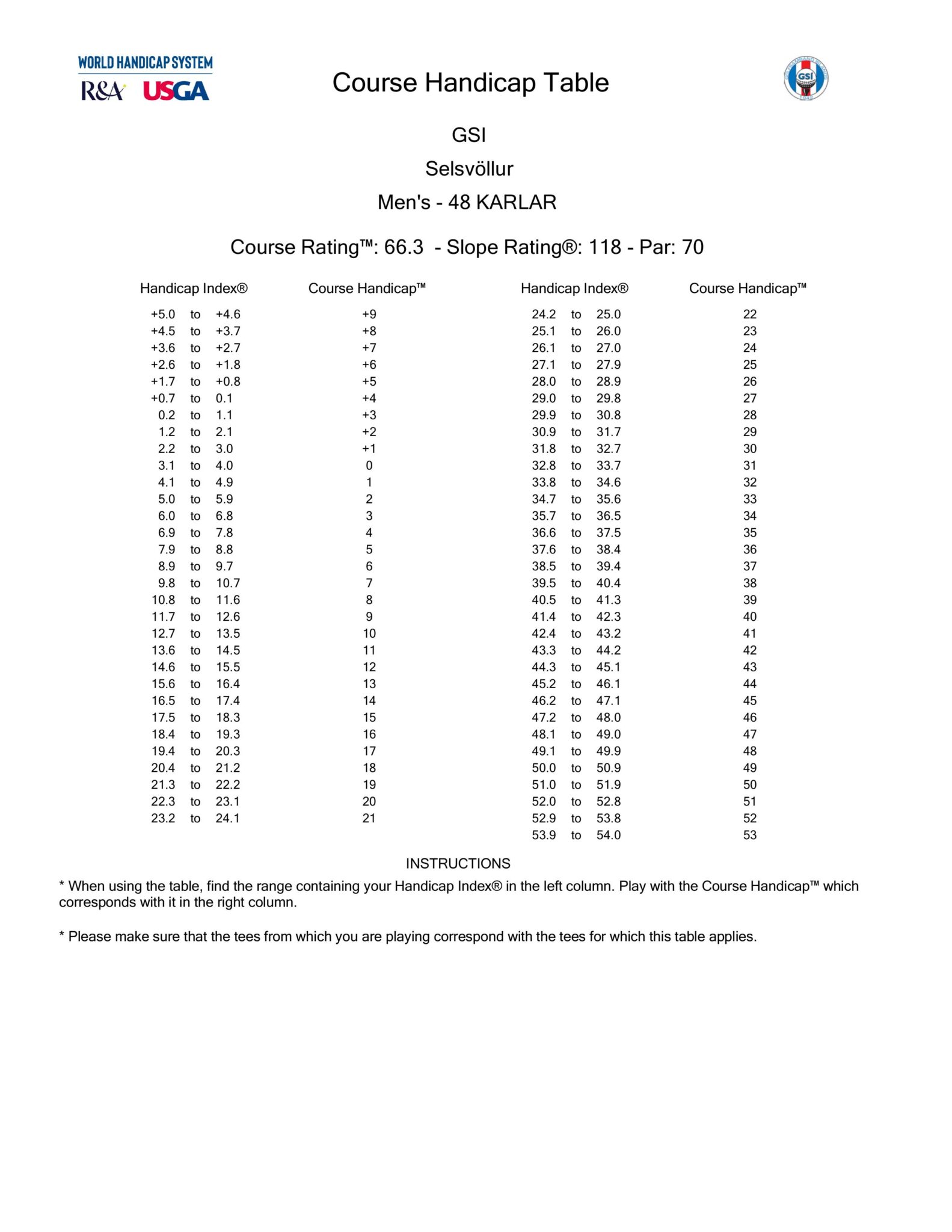 Hér eru forgjafartöflur fyrir Selsvöll