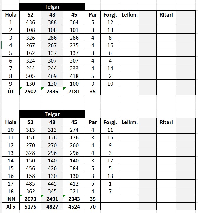 Skorkort elsvöllur er par 70 þar sem boðið er upp á 3 teiga sem merktir eru miðað við heildarlengd vallarins af viðkomandi teigum:52 – 48 – 45